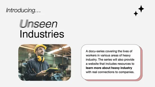 Our solution: a Netflix-style docu-series along with a website designed to reimagine how heavy industry tells its story. Through bold branding, dynamic layouts, and storytelling-focused visuals, this project transforms a complex climate challenge into a format that is approachable, inspiring, and conversation-starting.